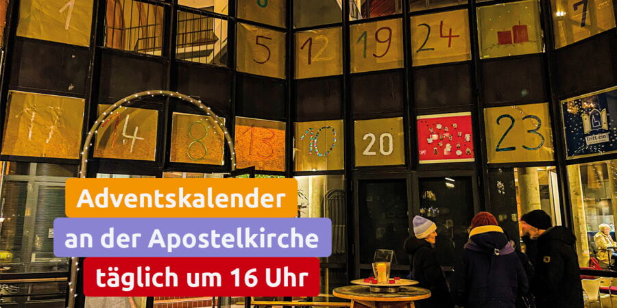 Jeden Tag öffnet sich ein neues Türchen und ein weiteres Bild erscheint. Gemeindegruppen oder Einzelpersonen haben für Euch gemalt, gebastelt, getextet, um Euch täglich mit einem Advents-Impuls zu erfreuen. Kommt um 16 Uhr zur Apostelkirche und schaut, wie das Bilderkaleidoskop wächst, singt mit uns Adventslieder und knabbert einen Adventskeks! Euer Team "Leben an der Apostelkirche" heißt Euch am Adventskalender im Atrium willkommen.