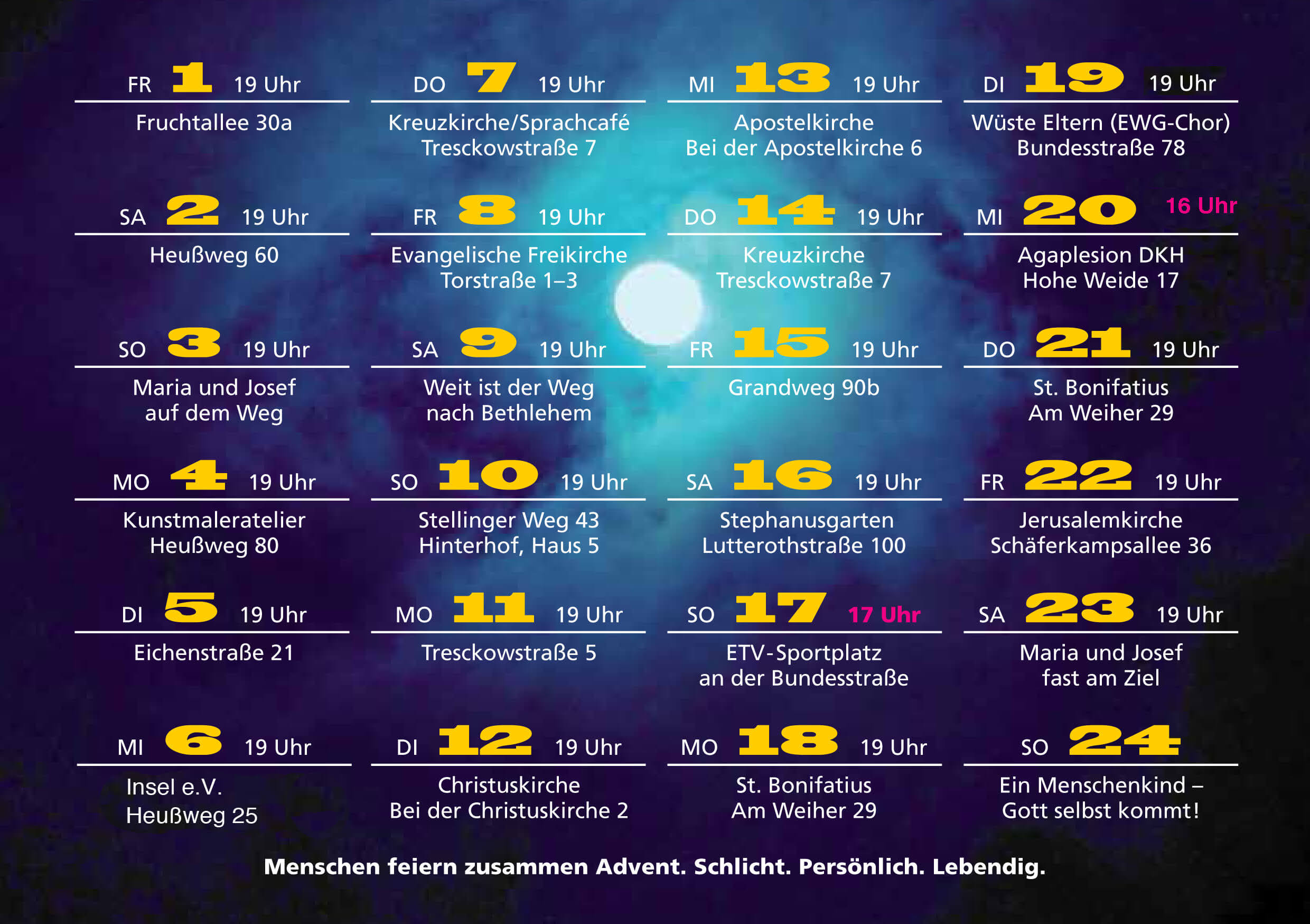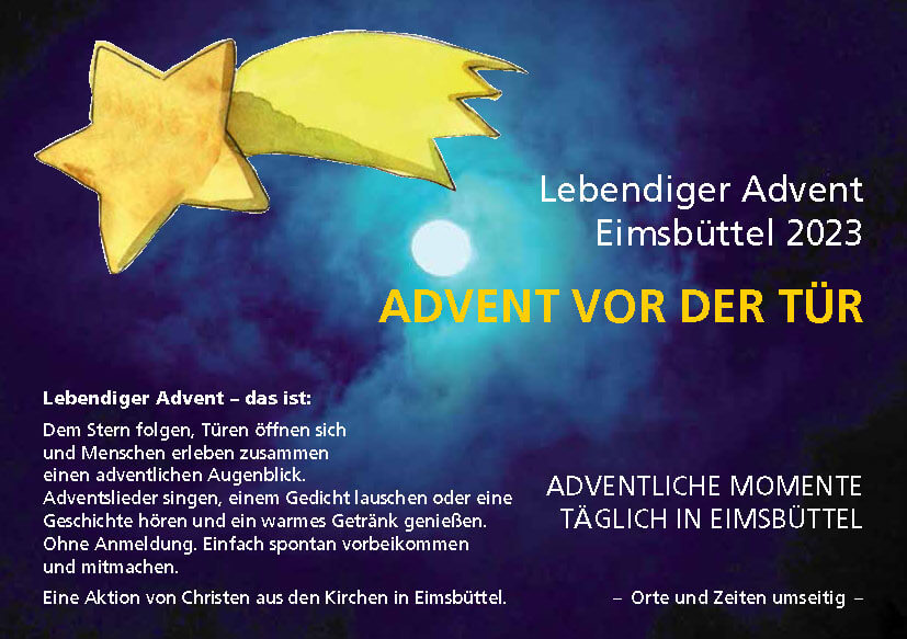 Eine Aktion von Christen aus den Kirchen in Eimsbüttel: Lebendiger Advent vor der Tür in Eimsbüttel 2023. Täglich vom 1. bis 22.12.23, meist um 19 Uhr (Ausnahmen siehe Programm).
