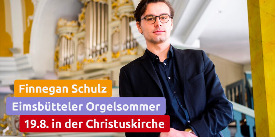 Zum Abschluss des 21. Eimsbütteler Orgelsommers spielt diesen Samstag, 19.08. in der Christuskirche ab 12 Uhr Finnegan Schulz (Hamburg) an der Orgel Werke von Clérambault, Rinck, Bach und anderen.