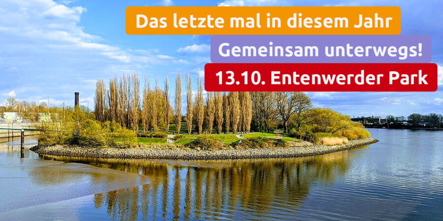 Zum letzten mal in diesem Jahr "umsonst und draußen" vor der Winterpause sind wir am 13. Oktober ab 10.00 Uhr GEMEINSAM UNTERWEGS. Wir hoffen auf einen sonnigen Oktobertag und wollen gemeinsam den Entenwerder Park erkunden, im Café mit Elbblick verweilen. Treffpunkt: 10.00 Uhr im Gemeindehaus Christuskirche.