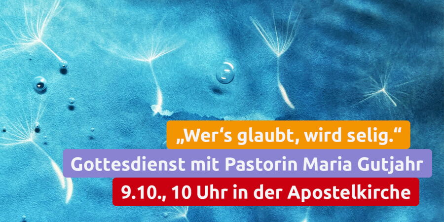 »Wer‘s glaubt, wird selig.« Mir rutscht dieser Satz häufiger raus, als mir lieb ist. Als wäre es nicht angemessen zu glauben. Als wäre ich naiv und nicht genug aufgeklärt. Tja, dass mit dem Glauben ist so ein Ding. Ding? Dinge sind verfügbar. Ist das mit dem Glauben so einfach? Fühlt euch eingeladen zum Gottesdienst in der Apostelkirche um 10 Uhr.