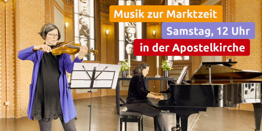Die Apostelkirche ist immer samstags zwischen 10.00 und 12.30 Uhr geöffnet, mit einer Kurzandacht um 12.00 Uhr. Jeweils am ersten Samstag eines Monats ist um 12.00 Uhr die "Musik zur Marktzeit" zu hören. Wir laden Dich im Rahmen der offenen Apostelkirche zur Musik zur Marktzeit ein.
