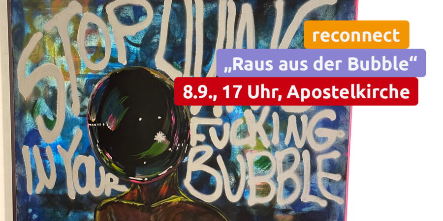 „Raus aus der bubble“ ist das Motto unseres nächsten RECONNECT-Gottesdienstes im offenen Atrium, vor der Apostelkirche. Offen wie der Ort wünschen wir uns auch unsere Begegnungen!