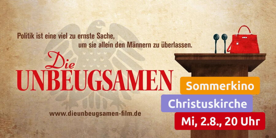 Mittwochs ist Kinotag. Am ersten Mittwoch im August auch bei uns! Das "Sommerkino" mit dem Film "Sommerrebellen" letztes Jahr war schön! Auch in diesem Jahr soll es ein Sommerkino geben: Am Mittwoch, den 2. August 2023 zeigen wir um 20 Uhr im Gemeindesaal der Christuskirche den Film "Die Unbeugsamen" von Torsten Körner. "Der Film erzählt die Geschichte der Frauen in der Bonner Republik, die sich ihre Beteiligung an den demokratischen Entscheidungsprozessen gegen erfolgbesessene und amtstrunkene Männer wie echte Pionierinnen erkämpfen mussten" (aus der DVD-Hülle). Es wird Kühles zu trinken geben und natürlich darf auch Popcorn nicht fehlen!