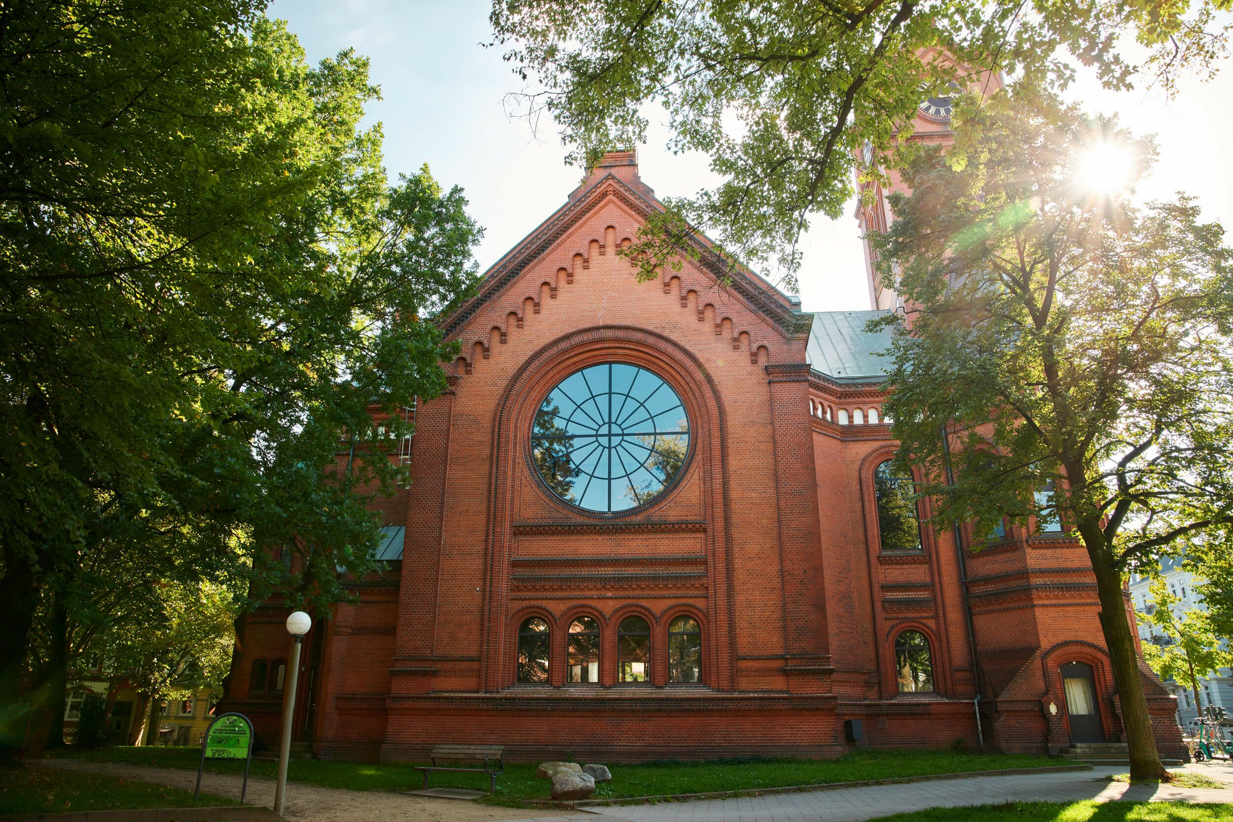 Wir treffen uns regelmäßig unter dem großen, runden Fenster der Apostelkirche.