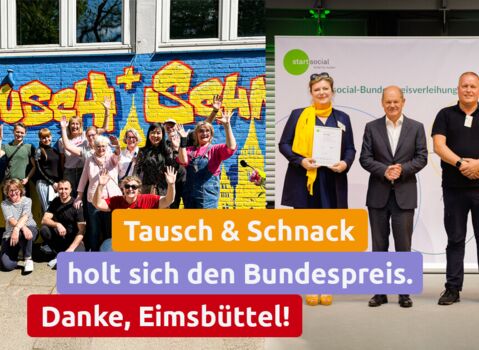 Wir freuen uns riesig über den Bundespreis von startsocial. Am 13. Juni 2023 wurden wir unter anderem von Bundeskanzler Olaf Scholz geehrt. Der Preis ist einer von sieben. 100 startsocial Stipendiat:innen hatten sich darum beworben, aber Eimsbüttel hat gewonnen! Wir sind stolz auf diese Leistung und danken allen Eimsbütteler:innen, denn ohne Euch wäre dieses Projekt nicht möglich! Unterstützt uns auch weiter mit Euren aussortierten Haushaltsartikeln, Spielzeugen, Zeit- und Geldspenden! Der Ansturm der Bedürftigen reißt nicht ab. Deshalb: Schaut doch bitte nochmal in Euren Schränken nach und sortiert aus, was Ihr nicht mehr benötigt. Wir haben sehr dankbare Abnehmer:innen dafür.